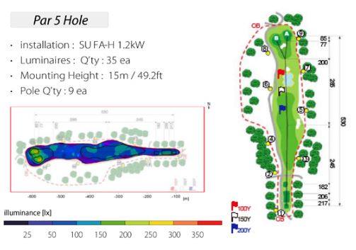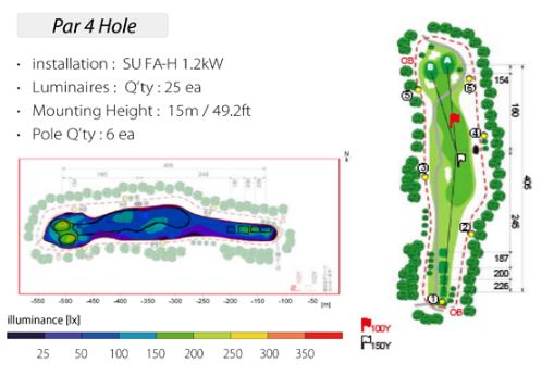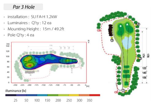 To ensure clear visibility of the ball along the entire fairway, ensure wide-ranging coverage across the area. Ensure illumination of shadowy spots caused by obstructions or topography, aiming the lighting to track the ball’s flight and trajectory as it heads toward the fairway.